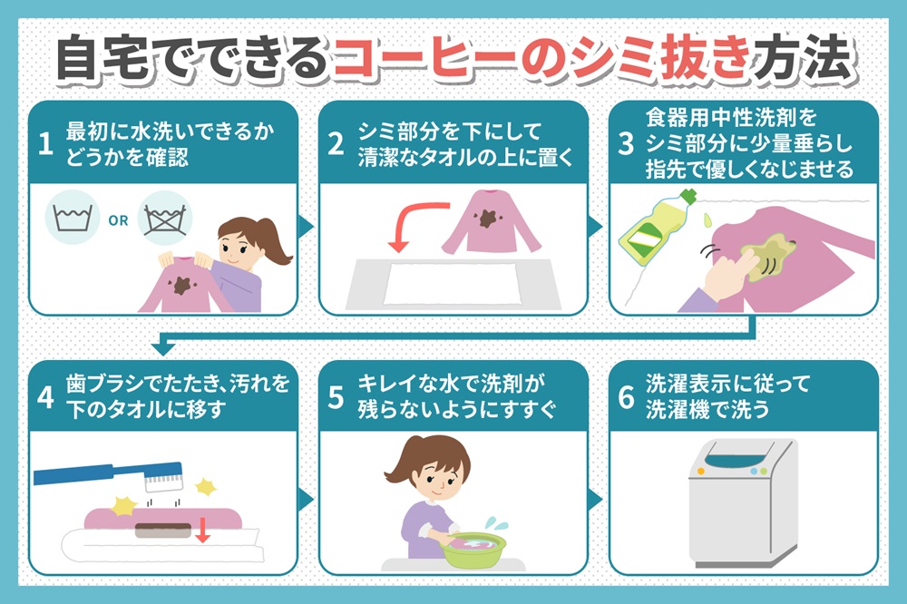 できるだけ早く洗濯することで、コーヒーの色素成分が繊維に定着するのを防止できます。