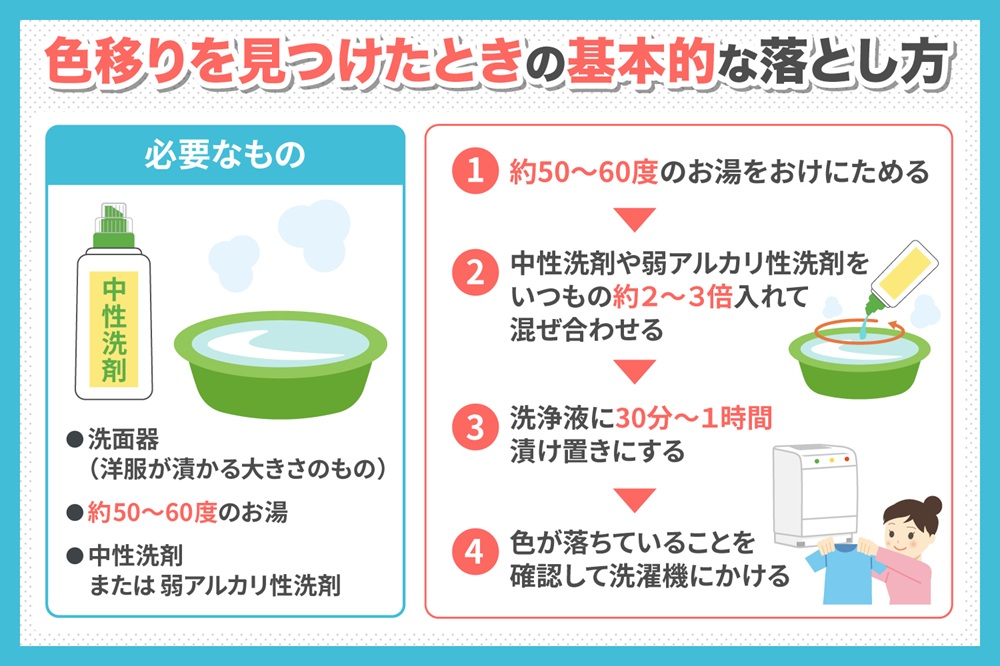 - 色移りは中性洗剤や酸素系漂白剤で落とせる可能性がある
