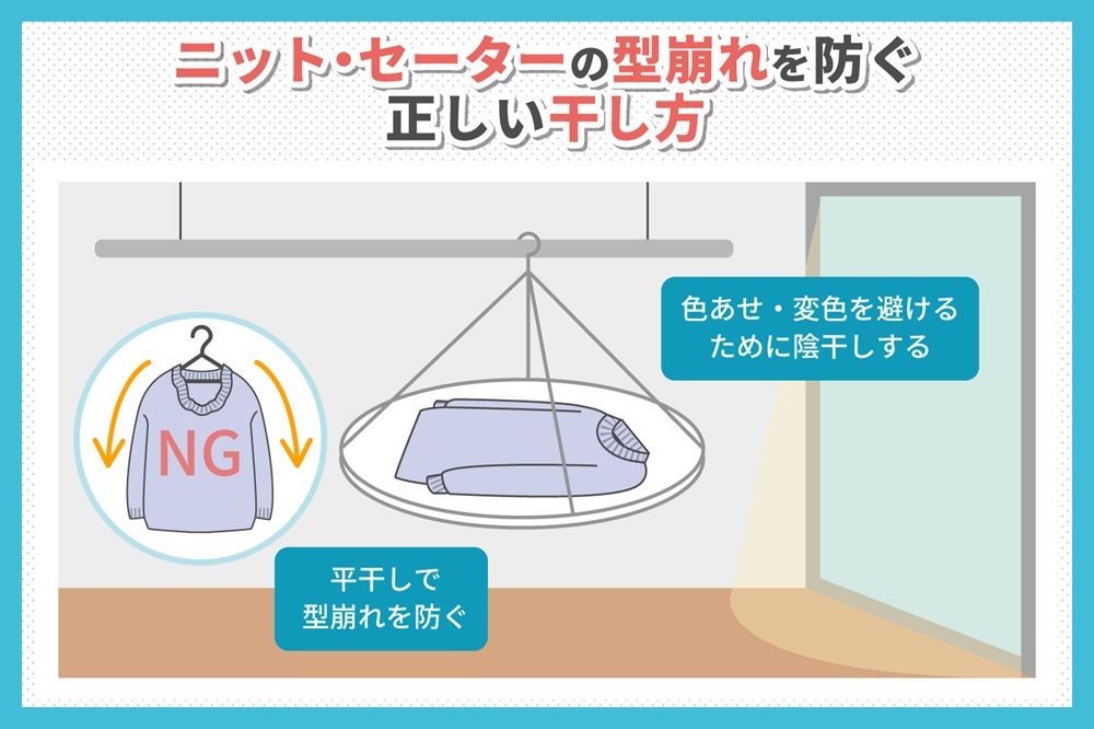 ニット・セーターは、ハンガー干しではなく平干しで乾かしましょう。ハンガー干しは肩の部分が伸び、型崩れの原因になります。平干しは衣類を平らな状態で乾かす方法のため、型崩れを防止できます。