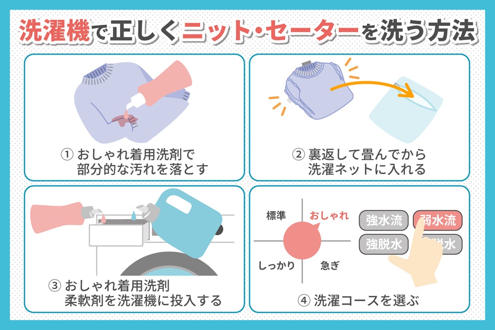 ニット・セーターを長持ちさせるには、洗濯機での正しい洗い方を確認しておくことが大切です。洗い方の順番は、以下の通りです。